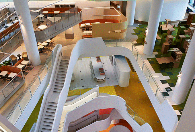 我們看到的滿眼的錯(cuò)綜復(fù)雜的樓梯從一般的觀點(diǎn)看來的確非常震撼,很酷。通常我們會(huì)很關(guān)注我們要到達(dá)的地點(diǎn),而往往忽略到達(dá)過程所處的空間。而這個(gè)特殊處理的樓梯則成為這里空間的焦點(diǎn),幾乎從任何地點(diǎn)都可以“感受”到它的存在,達(dá)到不被忽略的目的。